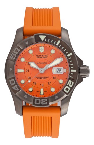 Black PVD stainless steel case with a orange rubber bracelet. Unidirectional rotating with 60 minute diving scale bezel. Orange dial. Self-winding automatic movement. Scratch resistant scratch resistant sapphire crystal. Case diameter: 43mm. Case thickness: 14.5mm. Screw-in exhibition case back. Black PVD stainless steel tang clasp. Water resistant at 500 meters (1650 feet). Victorinox Swiss Army Dive Master 500 Mecha Mens Watch 241354.