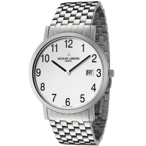 The Jacques Lemans Men's Geneve Collection Baca Watch is a fine men's timepiece with a distinctly classic style. The round case and fixed bezel are made of enduring, silver-toned stainless steel. Protected beneath an antireflective-sapphire window, the simple and ageless while dial contains only two black hands, 12 black Arabic numerals, date display at the three o'clock, and a subtle Jacques Lemans logo at the top and center. The link bracelet is made of durable, silver-toned stainless steel and connects with a deployment clasp with a push button. This watch keeps precise time using Swiss quartz movement and is water resistant to 99 feet (30 meters).