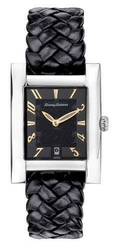 You can practically feel the ocean breezes when you strap on this distinctive casual watch from the king of island-inspired design, Tommy Bahama. The rectangular charcoal dial has a patterned inner dial with a tonal island motif. Goldtone Arabic numerals frame the outer dial, and a small window at the 6 o'clock position displays the date. This watch offers three-hand function with luminous hands for easy reading at night. The dial is set in a sleek rectangular steel case and presents on a handsome black woven leather strap that fastens with a buckle closure. This watch features a long-life battery and is water resistant to 165 feet.