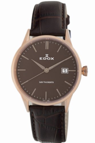 This Edox Les Vauvertz watch is a beautiful Swiss timepiece. The brown dial featuring a date window and second hand is protected by a sapphire anti-reflective crystal. The brown leather strap closes neatly with a buckle clasp. You can be sure to awe the audience with this exquisite watch.